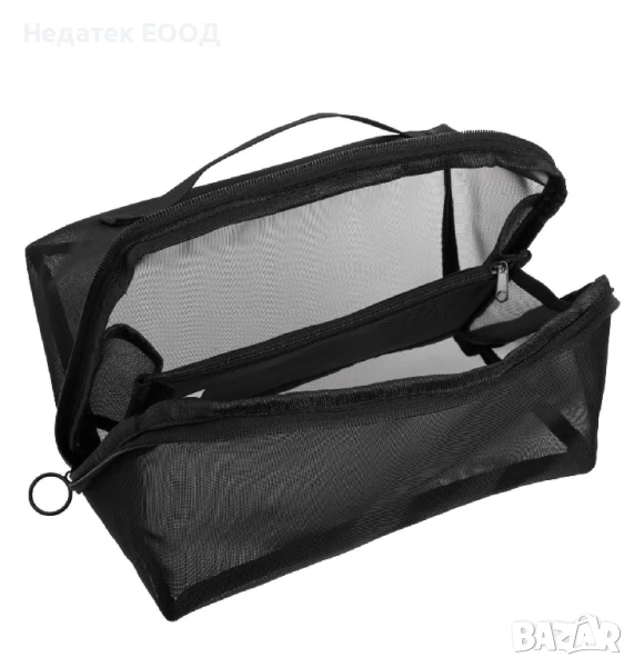 Найлонова мрежеста чантичка за тоалетни принадлежности, в черно. Има цип и черна дръжка.