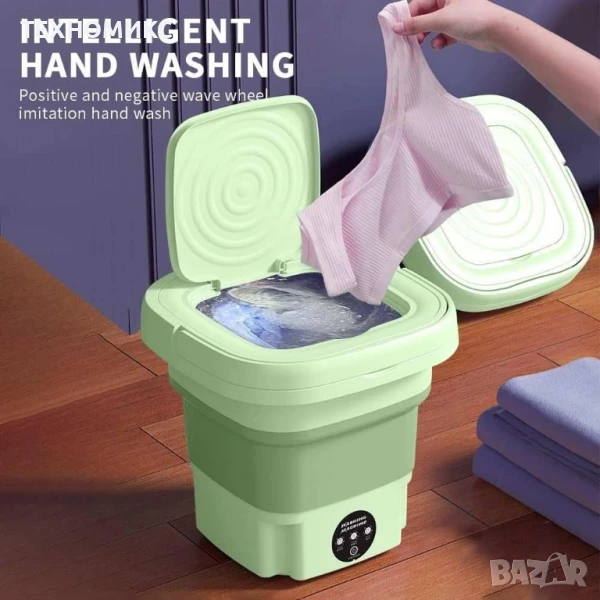 Електрическата преносима пералня впечатлява с компактен и стилен дизайн, създаден с мисъл за практичност и съвременна естетика. Моделът разполага с горен отвор за зареждане на прането, което осигурява удобен достъп и спестява пространство – идеално решение за малки апартаменти, общежития или къмпинг. Квадратната форма осигурява стабилност и лесно позициониране дори в ограничени зони. Цветовото решение в модерен зелен цвят придава свеж акцент и се вписва хармонично както в класически, така и в съвременен интериор. Управлението чрез сензорен панел (тъч контрол) е не само модерно, но и интуитивно – с ясни икони и бърз достъп до всички основни функции. Повърхността е лесна за почистване, а металното покритие добавя устойчивост и усещане за качество при допир. Със своя минималистичен, но функционален дизайн, тази пералня съчетава естетика, мобилност и удобство – всичко необходимо за съвременния начин на живот.