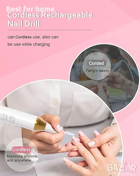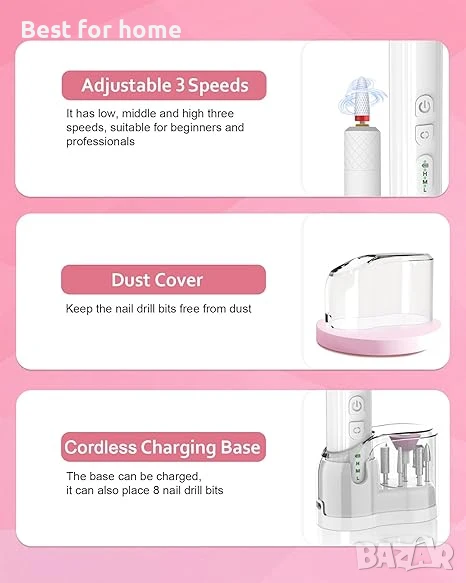 Акумулаторна и безжична работа: Безжичната бормашина за нокти може да се зарежда безжично през база и чрез вградено зареждане тип C. Електрическата бормашина за нокти може да издържи до 4 часа непрекъсната употреба, като може да се използва и по време на зареждане. Освен това, основата ѝ има 8 отвора и капак против прах за често използвани свредла.