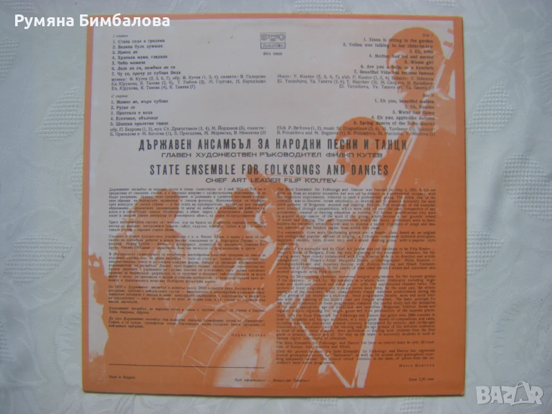 Муз. Ф. Кутев (2, 5, 6, 7), обр. Ф. Кутев (1, 3, 4). Солисти: В, Сидерова, Ел. Юрукова, Я. Танева (2, 6), Т, Райчев (3), М. Гергова, Н. Караджова, Ел. Юрукова, Я. Танева (4), Я. Танева (7)