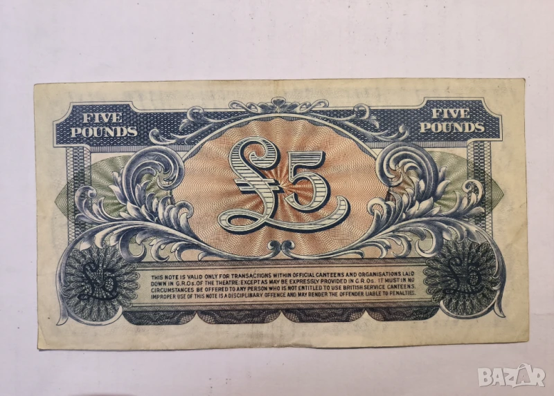 Британска армия 5 паунда 1958 г., снимка 1 - Нумизматика и бонистика - 50713512 Британска армия 5 паунда 1958 г., снимка 2 - Нумизматика и бонистика - 50713512 1/2