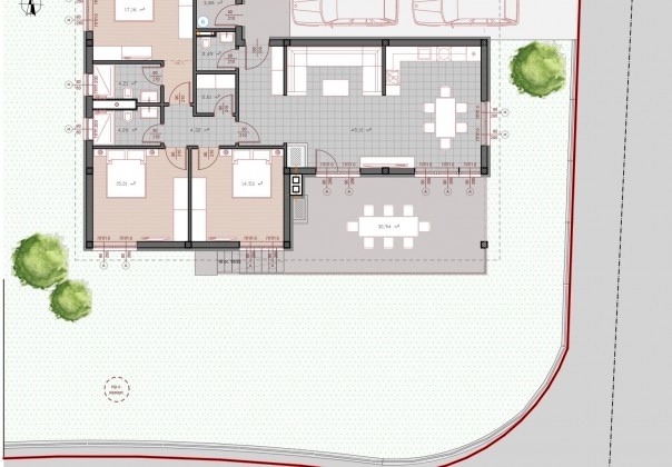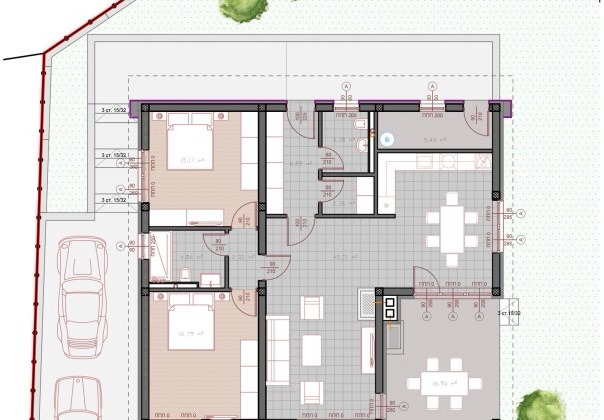 🟢 Разпределение: просторна дневна с кухненски кът, три спални, две бани, веранда, склад, перално помещение, гараж за два автомобила