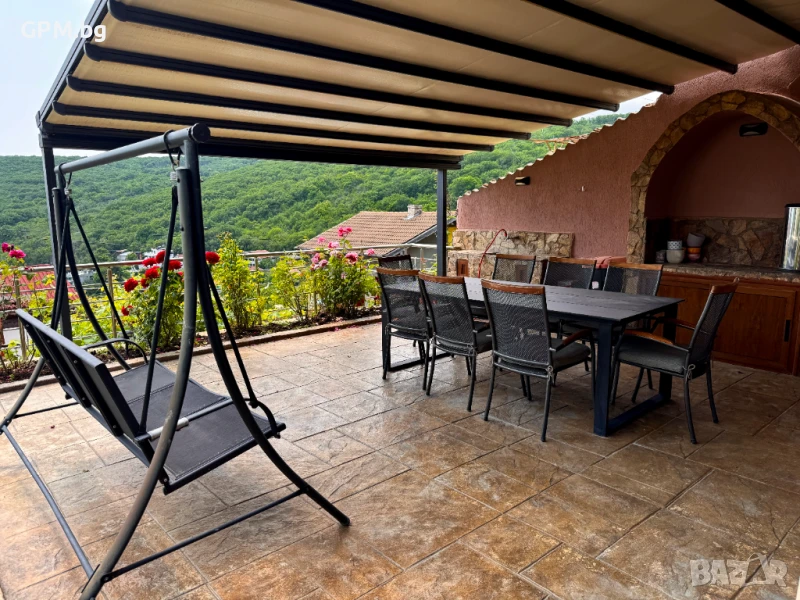 Външната част предлага градина със зеленина, маса със столове, люлка за почивка и възможност за паркиране на няколко автомобила.