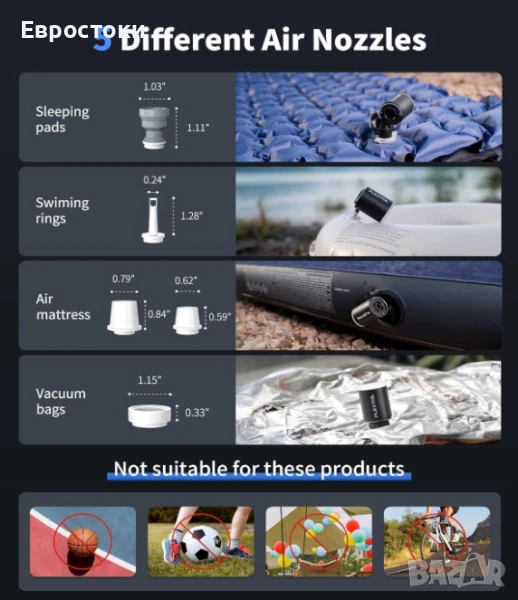 5 дюзи, широко приложение. Акумулаторната мини помпа е снабдена с 5 въздушни дюзи, те са съвместими с повечето форми и размери на надуваеми матраци, плувни пръстени, надуваеми мебели, играчки за басейн и др. Изработени от ABS, те са издръжливи и имат отлично уплътнение.