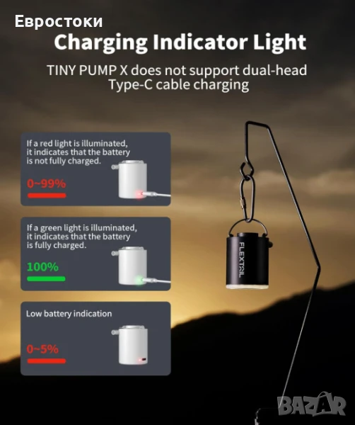 Акумулаторна батерия. Въздушната мини помпа се предлага с акумулаторна батерия, която осигурява 20 минути непрекъсната работа на помпата. Бърз Type-C интерфейс. Заредете я с външна батерия, лаптоп, зарядно за кола или адаптер.