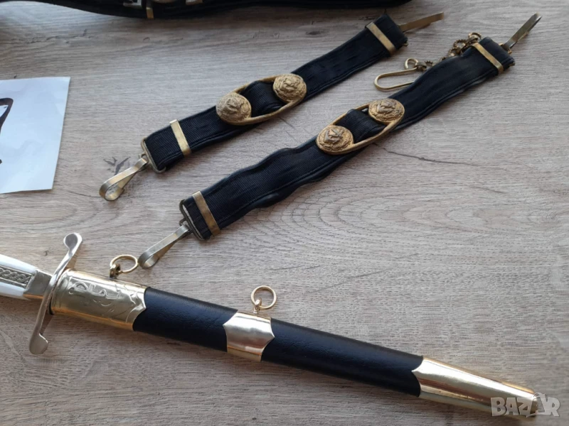 Кортик на Военноморския флот образец 1951г ПЪРВА ЕМИСИЯ автентичен. Колана и носачите са изработени от черна рипсена лента, подплатена с черна изкуствена кожа. Снимките показват всички детайли, въпроси по телефона.