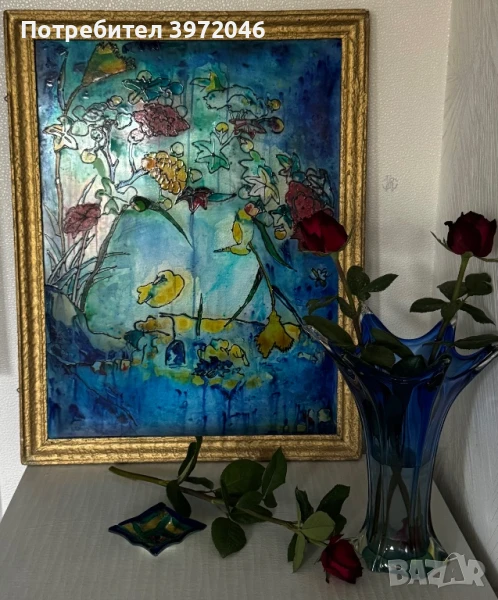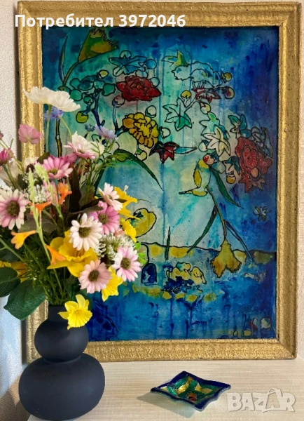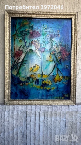 ⚜️Предлагам елегантно декоративно пано, изпълнено в техниката стъклопис, датиращо от средата на 20. век. Произведението представя абстрактна интерпретация на цветя, изградена чрез наситени цветови петна и силуети в синьо, жълто и червено — изразителна и модерна композиция, в която светлината играе ключова роля.