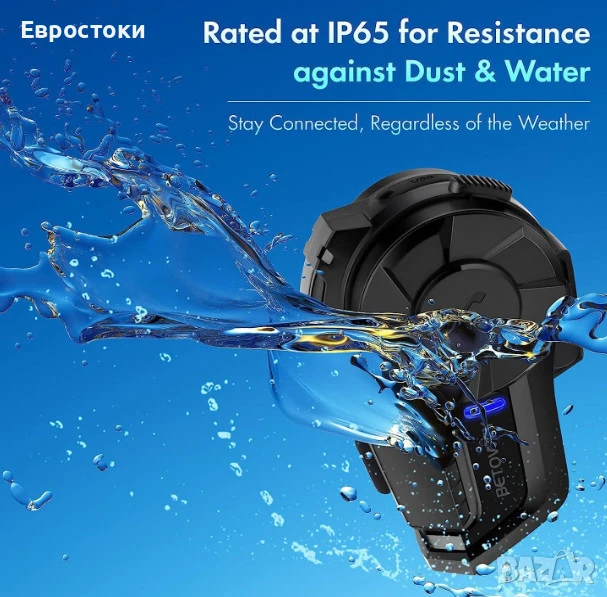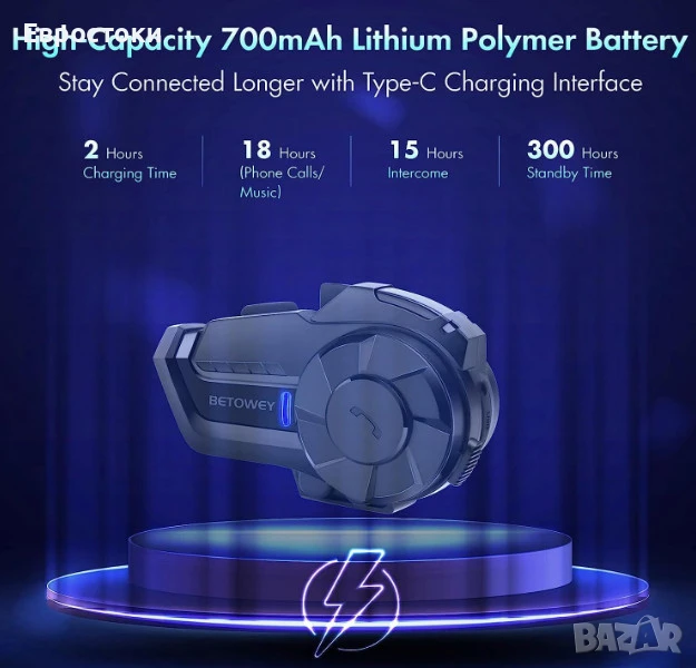 Дълъг живот на батерията за дълги пътувания. Снабдени с мощни батерии, слушалките BETOWEY B2X осигуряват до 20 часа непрекъсната употреба и 300 часа в режим на готовност, което гарантира, че ездачите ще се наслаждават на продължителни периоди на комуникация и забавление при дълги пътувания, без прекъсване от чести презареждания.