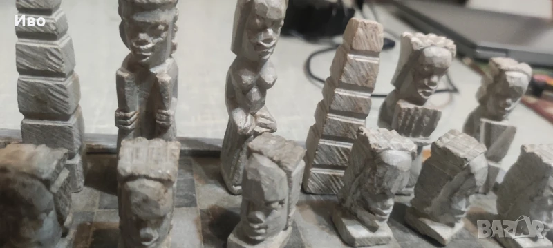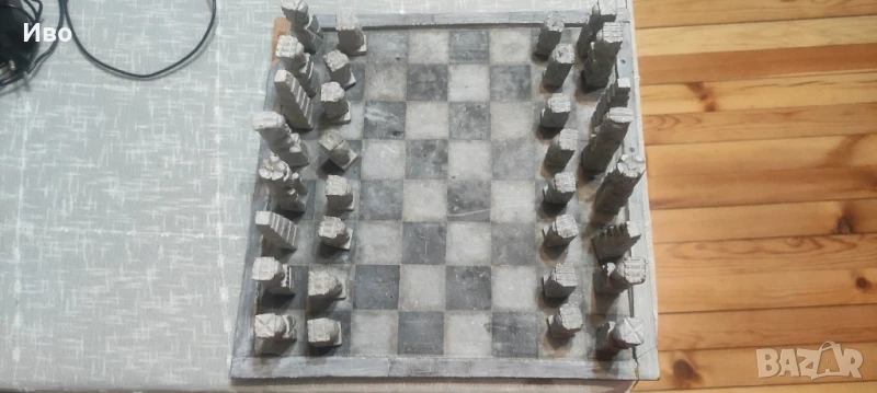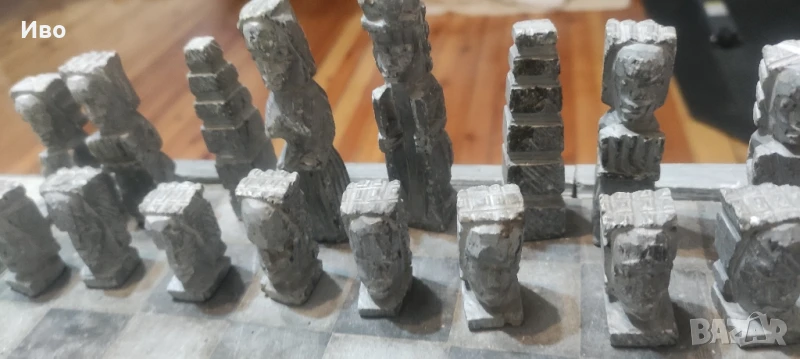 античен шах от дялан камък, дъската е от камък. ръчна изработка. внесен от Англия. на борда на дъската липсва едно малко парче, може да се замени с нещо друго. всички фигури са налични.