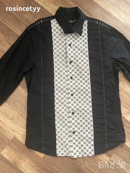 Официална мъжка риза. Подходяща за всякакви поводи. По етикет размер М. Черна с бели елементи отпред,няма еластичност. Изпращам с Еконт