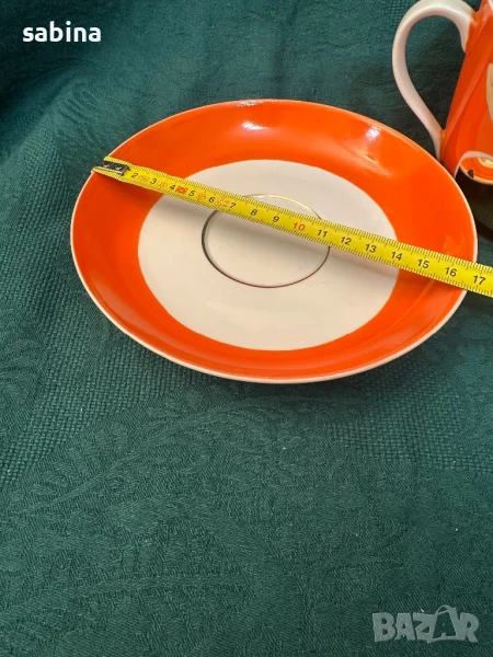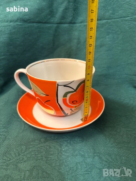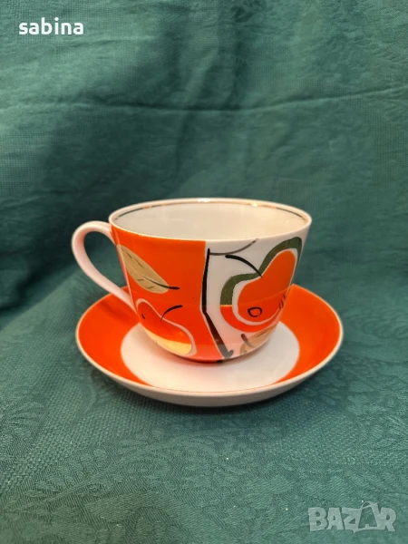 Винтидж рядък двоен сет ГИГАНТ за чай или компот „Златна ябълка“ на Дульово (Дулевский фарфоровый завод), СССР – 1968-1991 г. Изработен от качествен порцелан, ръчно рисуван и богато позлатен. Вместимост на чашата 500 мл, височина 9,5 см. Използва се за чай, компот и др. Витринно състояние, без забележки. Размери на снимките. Продавам 4 сета. Цена за 1 брой двоен сет – 45 евро