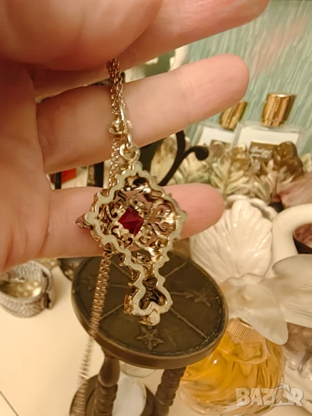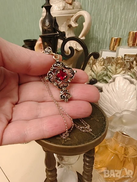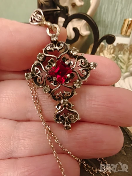 Стара ръчно изработена висулка с основен камък рубин и малки бели цирконий .Синджира е към нея и е позлатено сребро.Позлата има и по краищата на висулката.Дължина синджир 48 см Висулка с окачването 4,7 на 2,5 см Продава се с благотворителна цел .Крайна цена