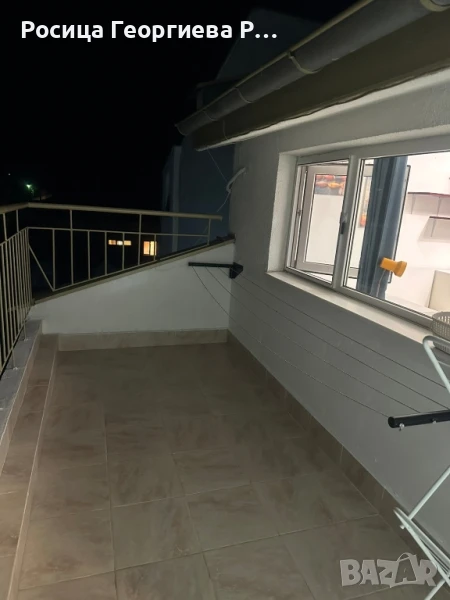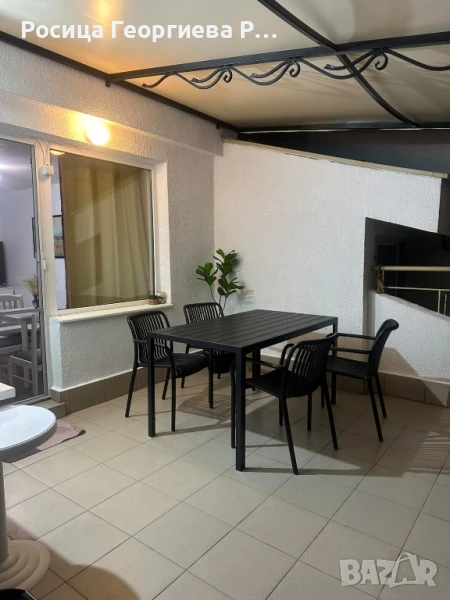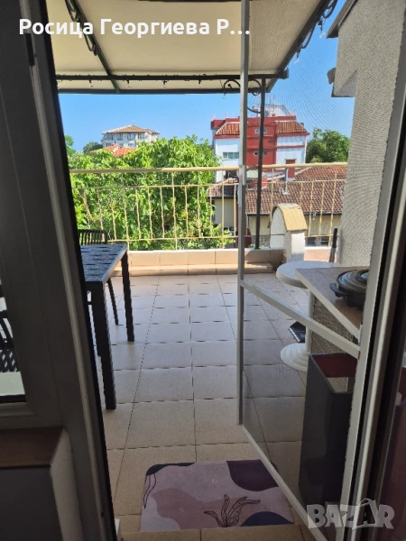 портманто. Апартаментът има един много голям балкон с прекрасна тента и морска гледка в далечината. Има маса и столове, както и помощна масичка и плот с уред за приготвяне на храна. Намира се на трети-последен етаж.