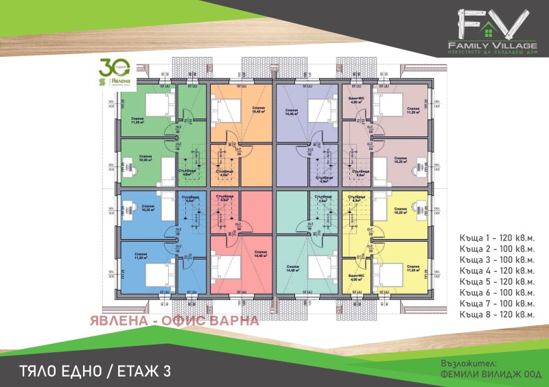 Етаж 3: Две спални (10 м? и 11 м?), сервизно помещение,стълбище.