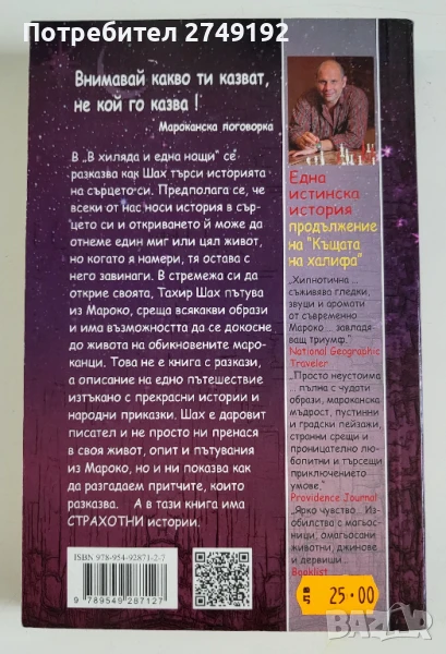 „В "В Хиляда и една нощи" се разказва как Шах търси историята на сърцето си. Предполага се, че всеки от нас носи история в сърцето си и откриването й може да отнеме един миг или цял живот, но когато я намери, тя остава с него завинаги. В стремежа си да открие своята, Тахир Шах пътува из Мароко, среща всякакви образи и има възможността да се докосне до живота на обикновените мароканци. Това не е книга с разкази, а описание на едно пътешествие, изтъкано с прекрасни истории и народни приказки. Шах е даровит писател и не просто ни пренася в своя живот, опит и пътувания из Мароко, но и ни показва как да разгадаем притчите, които разказва. А в тази книга има страхотни истории.