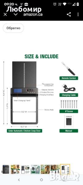 Двойни дистанционни управления за допълнително удобство: Тази врата на кокошарника се предлага с две дистанционни управления, осигуряващи двойно по-голямо удобство при управление на вратата. Независимо дали сте вътре в кокошарника или на разстояние, можете лесно да отворите или затворите вратата с натискането на един бутон.Многофункционален дизайн: Оборудвана с усъвършенствани функции, включително индикатор за зареждане със слънчева енергия, дисплей за захранване, управление със сензор за светлина и контрол на времето, тази врата за кокошарник предлага гъвкава функционалност, за да отговори на вашите специфични нужди. Тя разполага и с удобен дисплей за време за допълнително удобство.