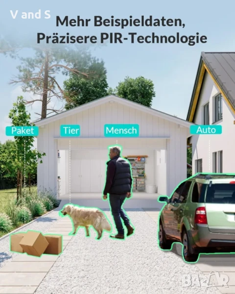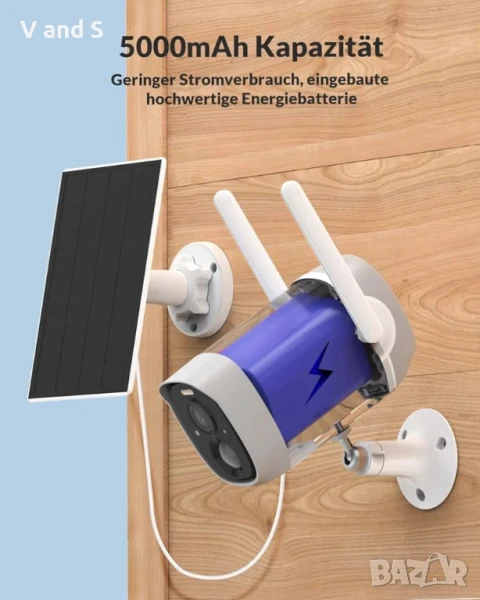 Безжична връзка и соларен панел: външната камера за наблюдение се захранва от батерия с презареждаща се батерия; външната камера не изисква окабеляване; може лесно да се инсталира някъде; IP камерата с батерия може да се захранва непрекъснато чрез свързан соларен панел.