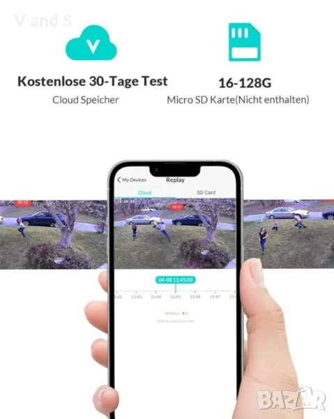 Двупосочно аудио и SD карта/облачно съхранение: външната камера за наблюдение има вграден микрофон и система от високоговорители, така че можете да проследявате наблюдението или да чатите по всяко време на вашия смартфон; IP камерата поддържа два метода за съхранение: SD карта до 128 GB (не е включена)/облачно съхранение.