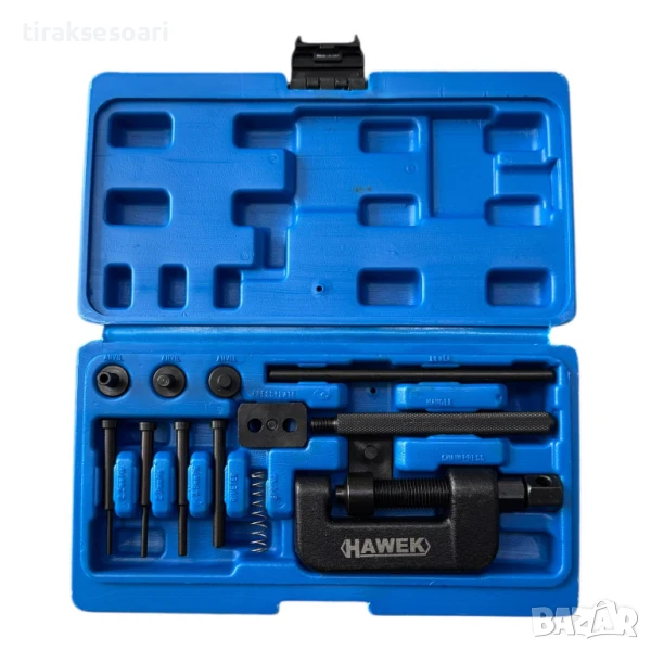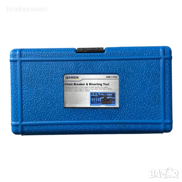Професионален комплект за разнитване и занитване на вериги HAWEK HW-1103 намира приложение за кримпване и разкъсване на ангренажни вериги и задвижващи вериги. Използва се в сервизи за мотоциклети, велосипеди и автомобили. Доставя се с пинове с размери 2.2 мм, 2.9 мм, 3.8 мм.