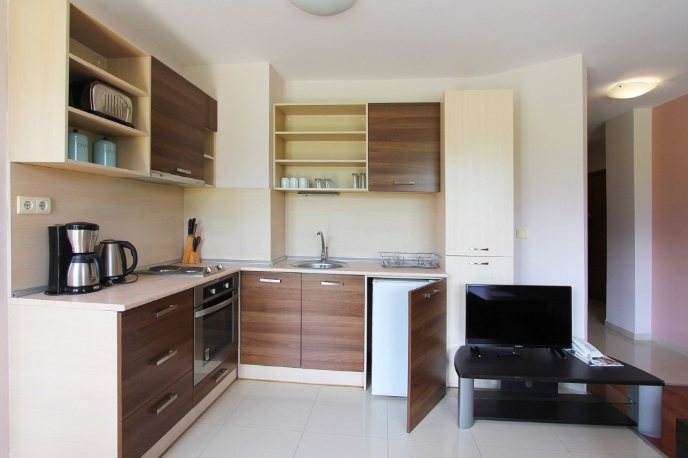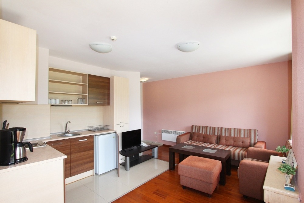 Всекидневната е обзаведена с мека мебел и кухненския кът. Кухнята разполага с всичко необходимо- горни, долни шкафове, хладилник, фурна, абсорбатор и трапезна маса с четири стола.
