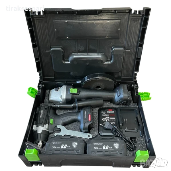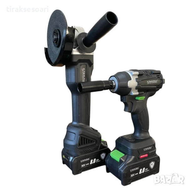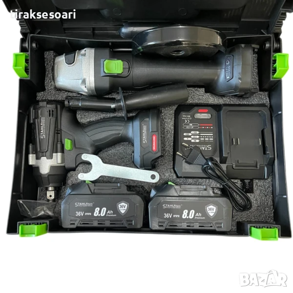2в1 ударен гайковерт, ъглошлайф, акумулаторен инструмент, 36V, 8.0A, STAHLMAYER, безжичен гайковерт, безжичен ъглошлайф, електроинструменти, акумулаторни машини, професионален комплект, ударен винтоверт, строителни инструменти, ремонт и монтаж, мултифункционален инструмент