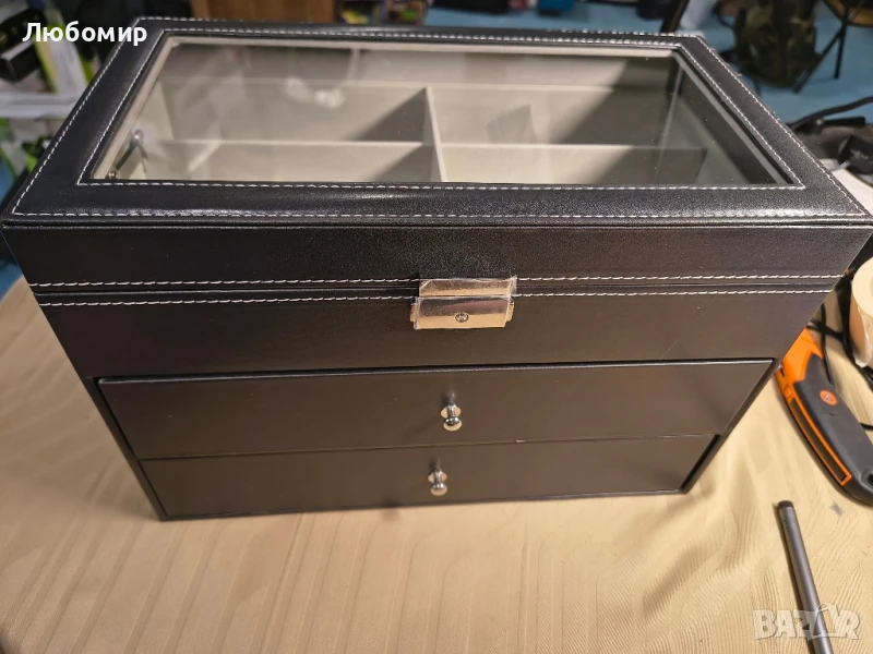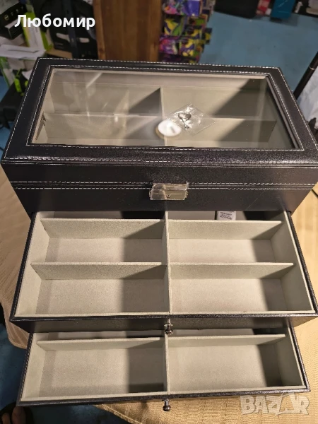 ази висококачествена кутия има място за съхранение на 18 очила. В отделенията, подплатени с мека материя, можете стилно да съхранявате очила за четене, слънчеви очила и обикновени очила. Тъй като капакът е изработен предимно от стъкло, имате добра видимост към цялото съдържание. Това ви спестява дългото търсене на очилата ви за четене. Органайзерът за очила, изработен от изкуствена кожа, може да се заключва с ключ (включен) и има 2 отделения, които могат да се изваждат.