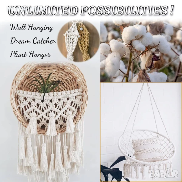 Чудесен за макраме проекти, висящи поставки за растения, ловци на сънища, плетени килими и др.