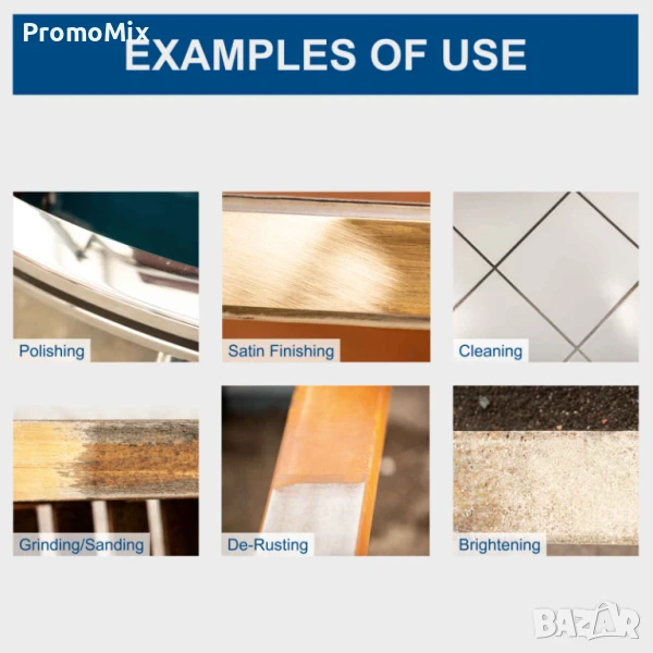 В комплекта е включена основна месингова четка, подходяща за почистване и обработка на метал, камък, както и на силно замърсени повърхности, като ръжда, стара боя и други наслоявания.