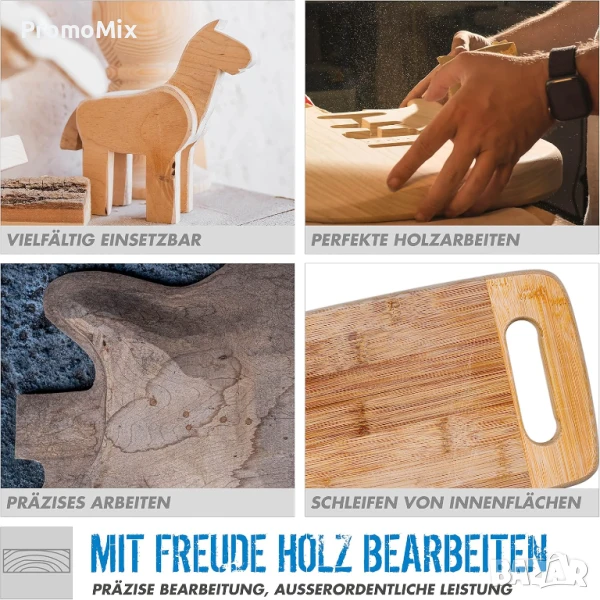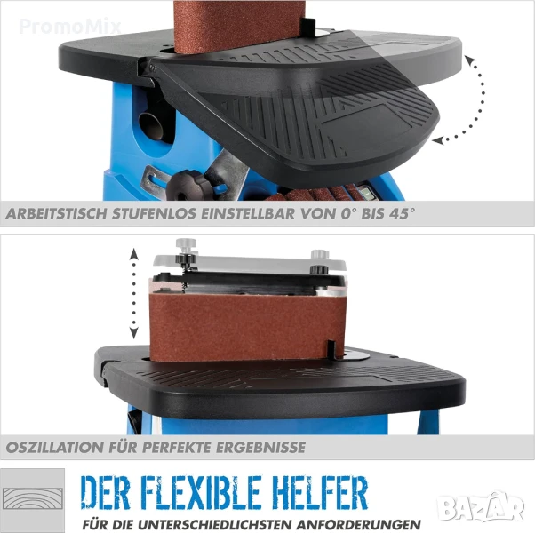 шлайфмашина 2в1 за прецизно шлифоване на дърво, пластмаса и метал, съчетаваща лентов механизъм и ролкови шкурки за вътрешно шлайфане и оформяне.