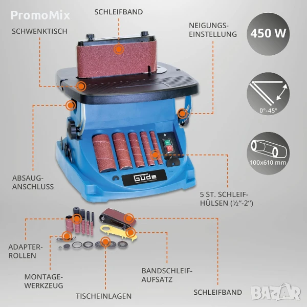 Шлифовъчна машина Gude GSBSM 450 450W Шпинделна лентова шлайф машина Осцилираща шлайф машина