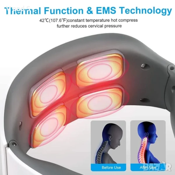 【Функция за постоянна температура 42°C】 Преносим интелигентен електромагнитен импулсен масажор за врата с термична функция, нов вграден термостат, с топлина от 42°C, която прониква в кожата на врата и дълбоко отпуска мускулите на врата.