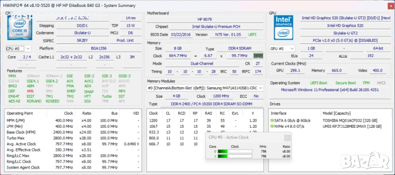 HP EliteBook 840 G3/14"/i5-6200U/8GB RAM/128GB SSD + 320GB HDD → Обява 50722720