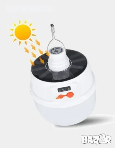 Чудесна, мощна и удобна акумулаторна къмпинг LED лампа за закачане с вградени батерии и соларно зареждане през деня и USB кабел нощно време.