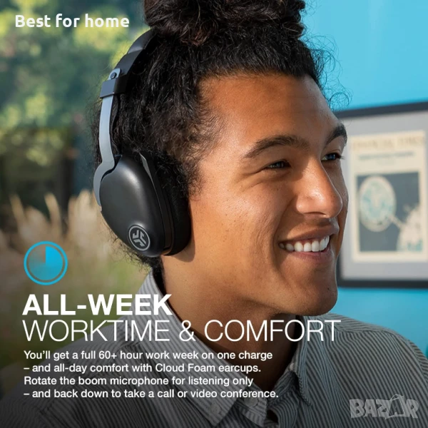 JLab JBuds Work безжични слушалки с микрофон за лаптоп, 60+ часа време за възпроизвеждане, Bluetooth слушалки за компютър, Teams, офис компютър, Multipoint Connect, Over-Ear кабелни или безжични