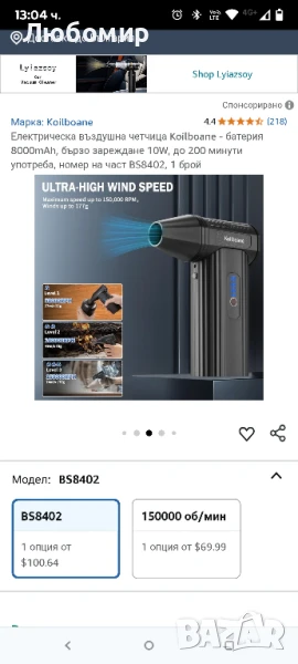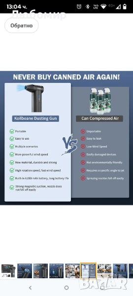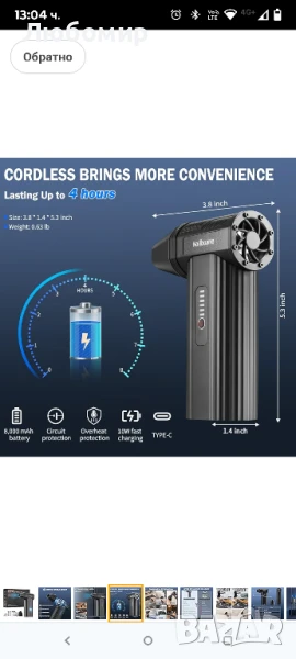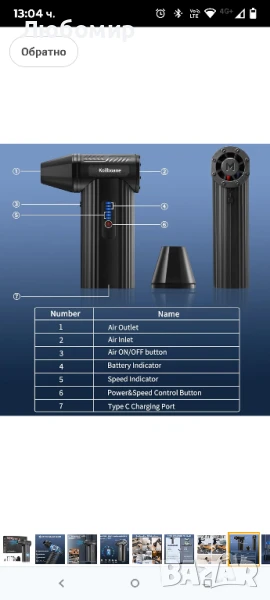 Електрическа въздушна четчица Koilboane - батерия 8000mAh, бързо зареждане 10W, до 200 минути употреба, номер на част Електрическата духалка за прах Koilboane има вградена акумулаторна литиева батерия с капацитет 8000mAh, която поддържа бързо зареждане от 10W и може да се използва непрекъснато до 200 минути след пълно зареждане. Батерията има защита от прегряване, няма нужда да се притеснявате от опасност от пожар.