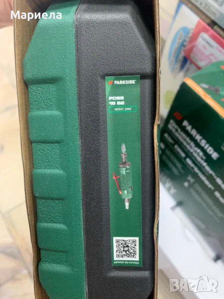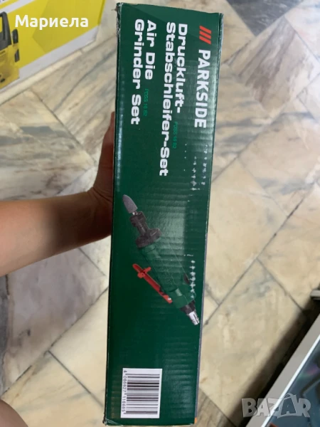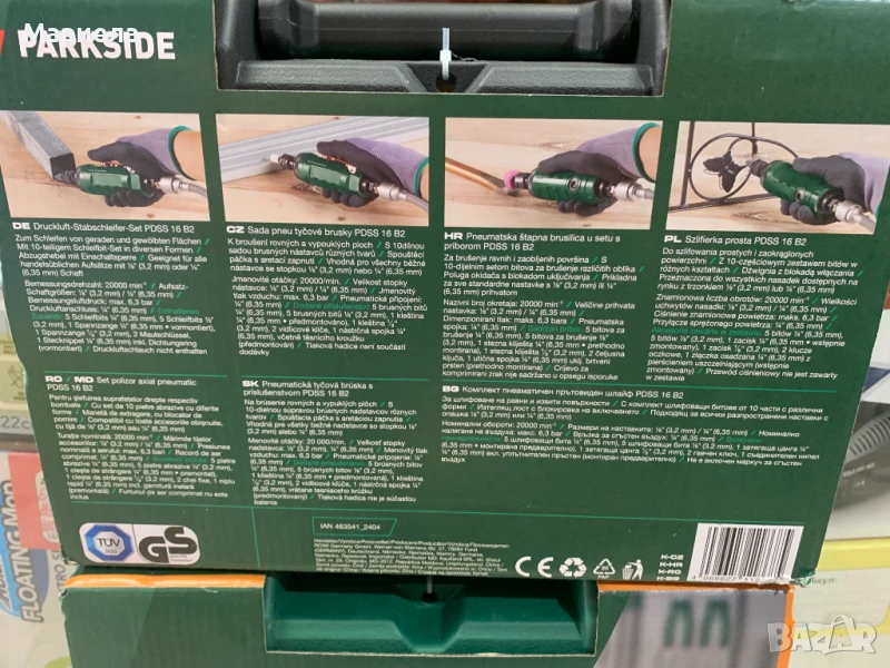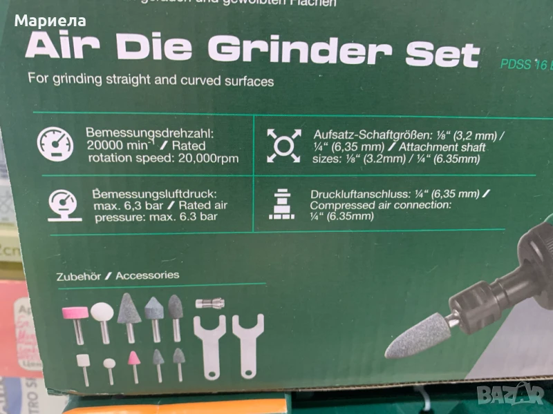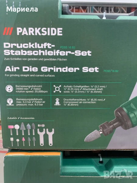 Към него има комплект шлифовъчни битове от 10 части с различни форми .