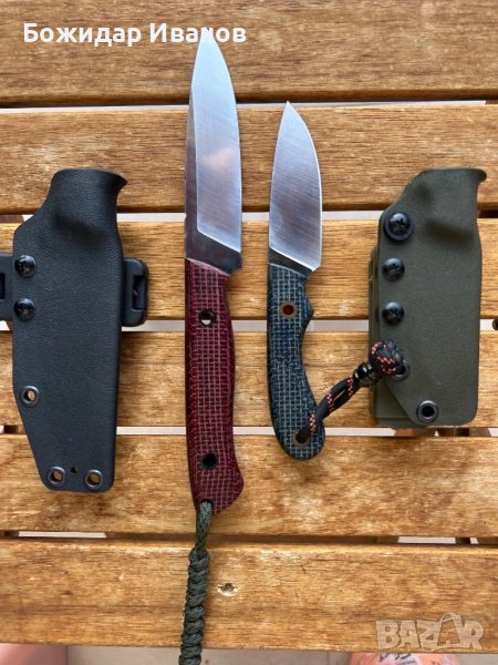 Ножовете са чисто нови, с кайдексови кании. По- големият е стомана Elmax, Дължина - 220мм, острие - 105мм, чирени - микарта, цвят бургунди.
