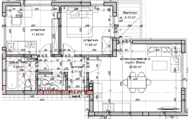 Разпределение: дневна с кухня- 26.80кв.м, спалня- 11.80кв.м, спалня- 11.70кв.м, тоалетна/перално, тераса и санитарно помещение.