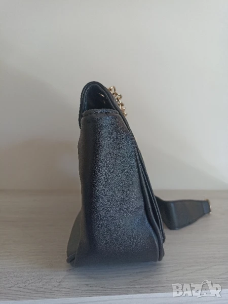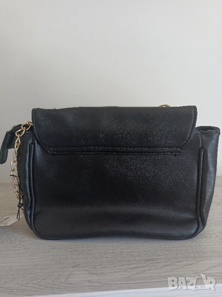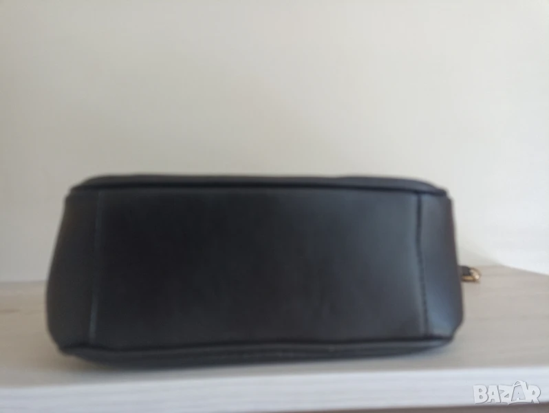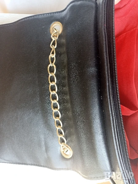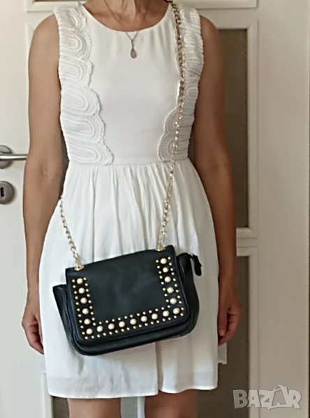 Черна кожена чанта с декоративни перли.Дръжка тип верижка.Едно отделение 24/19/9см.