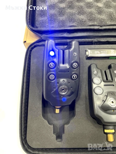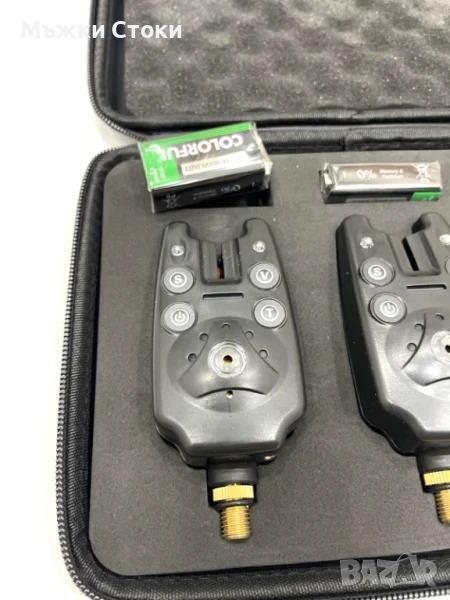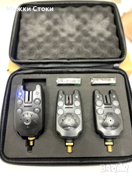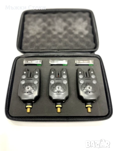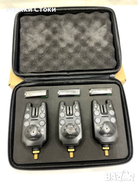 Страхотен комплект от 3 броя сигнализатори с много силен звук – до 80 метра обхват.Вървят с кожен калъф и 3 броя 9 волтови батерии.Имат букса за свързване с светещи оптегачи.Много качествени с няколко нива на сила на звука и няколко тона на звучене. 2.5 мм букса за свързване с оптегачи.