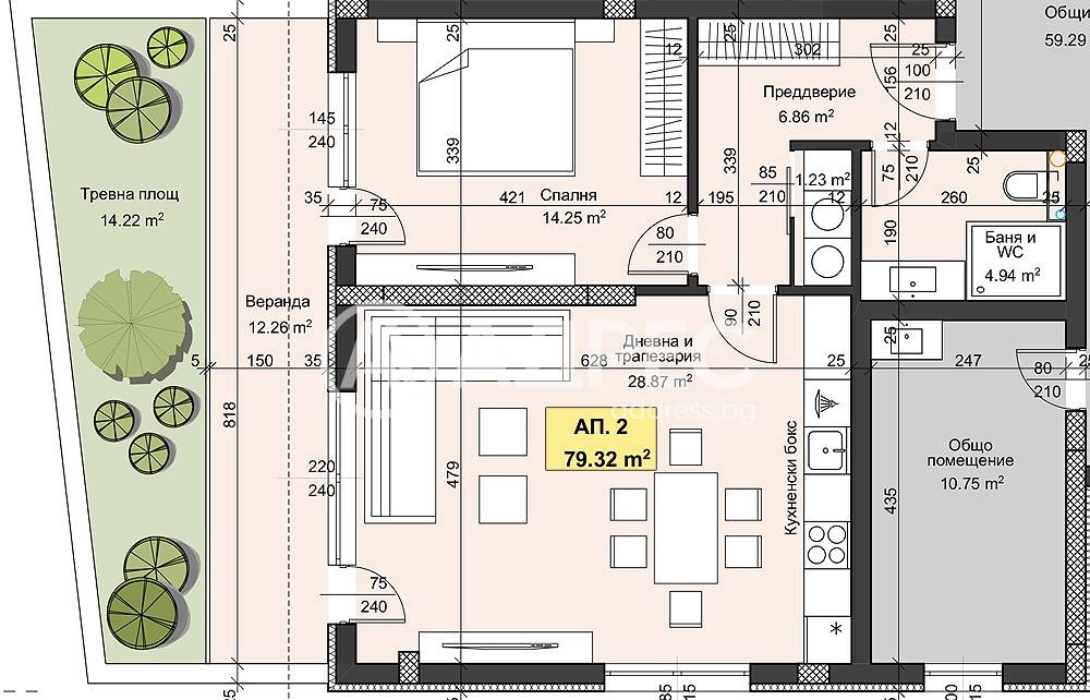 тревна площ - 14.22 кв.м.