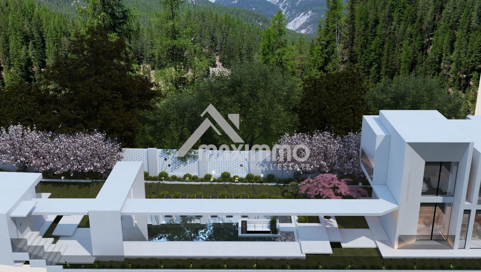 На парцел от 800 квадратни метра, в тиха и спокойна зона за живеене е разположен проект за минималистична къща с модернистична архитектура, големи стъклени витрини и тераси, придаващи уникален по рода си стил на два етажа. Първият етаж е с площ 154 м2, като на 82 м2 от тях са разположени просторна всекидневна с хол, трапезария и кухненска част, антре 11 м2, офис 20 м2, баня с тоалетна 6 м2 и лятна веранда с кухня 35 м2, която може да бъде открита изцяло посредством плъзгащите дограми, декоративните врати, както и биоклиматичната система на покрива.