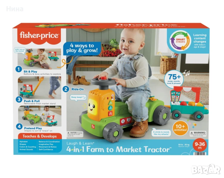 трактор и комплект за пазаруване с 4 опции за игра, които могат да се адаптират към възрастта на детето от новородено до малко дете: шофиране, игра в седнало положение, дърпане и ролева игра.