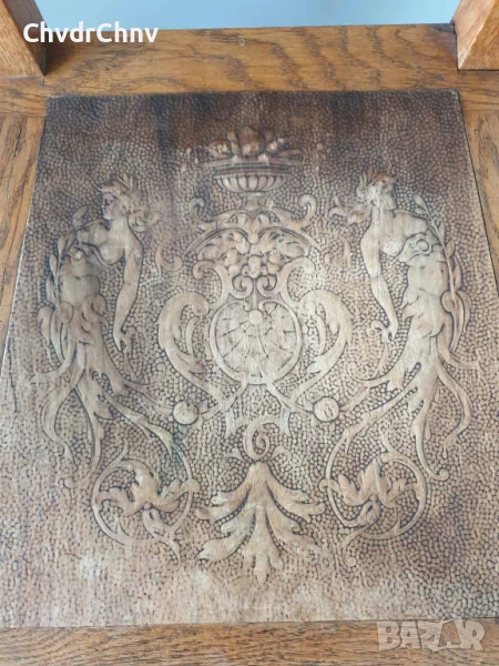Седалките са централно декорирани с релефни картини (показано) - всяка е с две женски фигури и цветя, по технология парене на дървото и пресоване/щампа с релефна метална матрица (НЕ Е КОЖА).