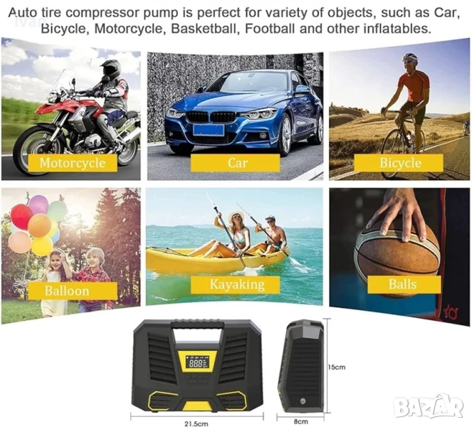 компресор за гуми с фенер за кола и различни накрайници. Верен помощник на всеки автомобилен фен. Включени накрайници за напомпване и на велосипеди, надуваеми уреди, топки и др.