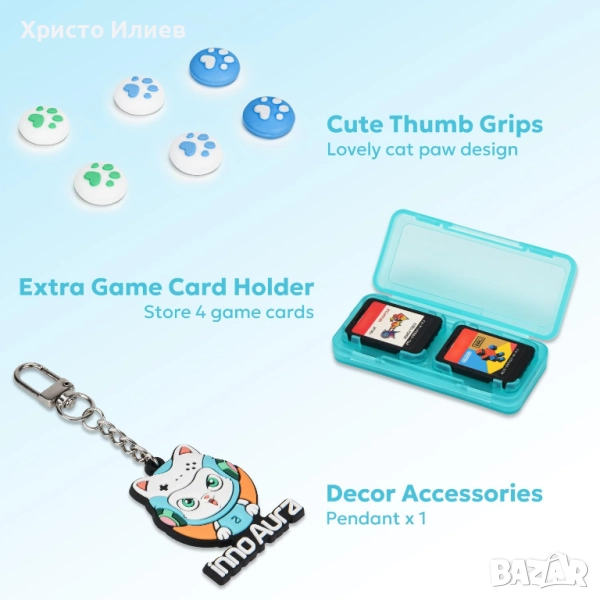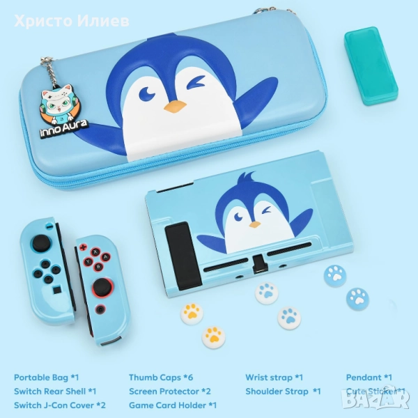 - Комплект аксесоари за Switch: Traditional Switch (2017) Switch Lite (2019) Switch OLED (2021) Чанта за транспортиране на Switch x 1, Защитен калъф J-con x 2, Защитен калъф за Switch x 1, Калъф за игра за Switch x 1, Протектор за екран за Switch x 2, Капачки за палци за Switch x 6, Сладка висулка x 1, Каишка за ръка x 1, Каишка за рамо x 1