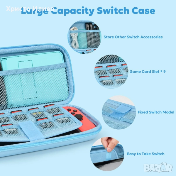 - Голям капацитет на чантата за Switch: защитният калъф за Switch предлага идеално решение за играчите, с мрежесто отделение за лесно съхранение на аксесоари за Switch. 9 специални слота за игрални карти. Закопчаването с велкро защитава вашата конзола Switch, а дизайнът с кабел осигурява бърз и удобен достъп.