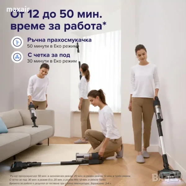 Почистете целия си дом с едно зареждане на батерията. Levoit LVAC-200 е снабдена с мощна литиево-йонна батерия и 2 регулируеми режима на работа, осигуряващи автономия на прахосмукачката от 12 до 50 минути.