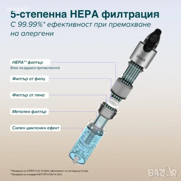 Модерната 5-степенна система за филтрация с HEPA филтър улавя до 99,99% от микроскопичните прахови частици, включително алергени, полени и косми от домашни любимци. Така прахосмукачката не просто чисти пода, но и пречиства въздуха във вашия дом – без риск от вторично замърсяване.