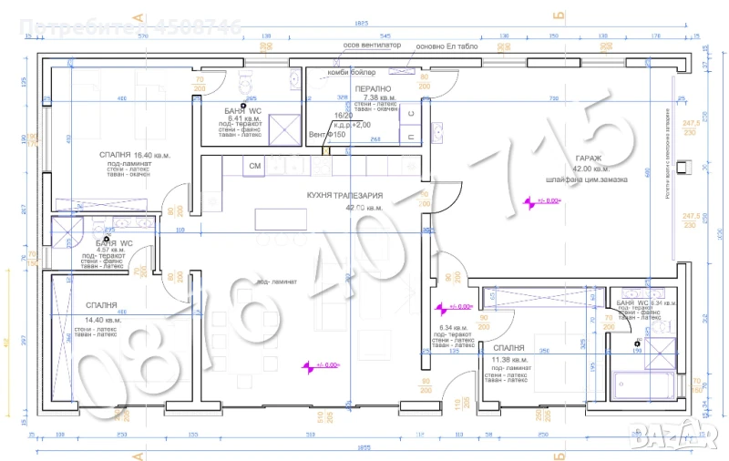 Собственик продава урегулиран ПАРЦЕЛ С КЪЩА на гредоред, партиди за ток и вода. Парцела с 30 м. лице, намиращ се на 500 м. от р. Дунав и на 400 м от кметството на гр. Мартен. Има ИЗДАДЕНО РАЗРЕШЕНИЕ ЗА СТРОЕЖ на нискоенергийна къща с двоен гараж и две парко места. От гаража има директен достъп до жилищната част. На приземния етаж е обособено общо помощение с холна и кухненска част от 42 м2. От хола има достъп до две спални (15 и 17 м2), всяка с индивидуална баня и тоалетна (5 и 7 м2). В източната част има обособена трета самостоятелна спалня за гости (12 м2), отново с индивидуална баня/тоалетна (7 м2). От гаража има достъп до сервизно помещение с площ 8 м2, в което да се разположат пералня, сушилня, термо-помпа и други обслужващи инсталации. На втория етаж се обособяват две помещения, които имат необходимата височина да бъдат използвани както за склад, така и за две допълнителни просторни спални, като достъпа до тях може да се организира и през хола. В двора е предвидено място за поставяне на БАСЕЙН с размери 5х10 м. Къщата е проектирана с изцяло южно изложение, с френски прозорци, съобразено с околните сгради и растителност, така че да осигурява максимално отопление от слънцето. Пред гаража е оставено достатъчно място, за да се оформят две допълнителни парко-места, а зад къщата за разполагане на до 18 кВт соларни панели и колектори за гореща вода